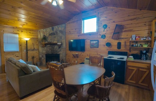 Escape to Wild Plum Cabins! 10 mins from downtown Eureka Springs, our charming retreat invites you to unwind. Enjoy an open living area with a cozy fireplace, fully equipped kitchen, and a Jacuzzi. Stay connected with Wi-Fi and streaming services, and sleep soundly in a king bed or queen sleeper. Relish the outdoors on our furnished deck with a grill, or gather around the fire pit. Cool off in the seasonal pool. Perfect for couples seeking a romantic getaway or families looking for adventure.