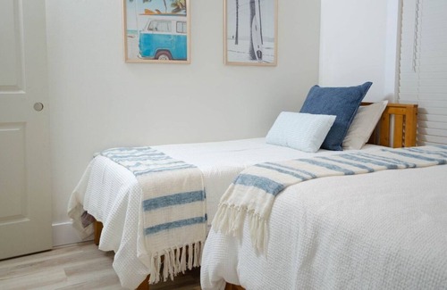 Your additional guest will sleep peacefully in the second bedroom which has a pillow-top Queen bed and a memory foam Twin bed and is perfectly decorated to make the experienced of future surfer feel right at home. There is room to hang clothing as well as a dresser in the closet. Additionally, behind the dresser you will find a twin foldaway bed that can be opened in either bedroom or in the living room to sleep a 6th guest comfortably. If your little ones aren't ready for a big bed just yet, we also have 2 toddler cots and a pack and play within the master closet as well.
