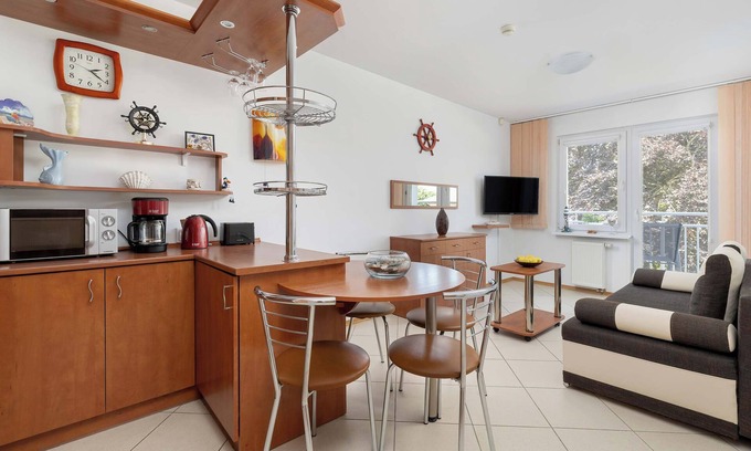 The apartment in the heart of Miedzyzdroje, is an ideal place for family or friends, offering a comfortable stay for up to 3 people. Upon entering the apartment, you will immediately feel its warm and cozy atmosphere. The spacious living room with kitchenette seamlessly combines leisure functions with the possibility of preparing meals. In the living room there is a comfortable double sofa bed, and opposite it there is a TV with terrestrial TV, perfect for evening relaxation after a busy day. The apartment also provides access to high-speed Wi-Fi. The kitchenette was designed with convenience and functionality in mind. It is equipped with an induction cooktop, refrigerator with freezer, microwave oven, electric kettle and coffee maker, allowing you to prepare your favorite meals with ease. In addition, there is a toaster at guests' disposal, ideal for a quick breakfast. There is a dining table next to the annex, where you can enjoy meals and conversations together. The bedroom offers a comfortable double bed, guaranteeing a restful and restorative sleep. Here there is also a TV, allowing you to watch your favorite programs without leaving your bed. From both the living room and the bedroom, you can access the spacious balcony, where balcony furniture awaits. This is an ideal place for morning coffee or evening relaxation. The bathroom is equipped with a toilet and shower, providing refreshment after a day at the beach. Complimentary toiletries (soap, shampoo and shower gel), towels and linens are provided to facilitate the start of each stay. Basic amenities such as a standing clothes dryer, vacuum cleaner, iron, and ironing board are also available for guests' convenience. For families traveling with small children, the apartment also offers a crib and highchair for the baby.