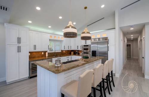 The bedrooms are spacious and designed for relaxation, with comfortable beds, soft linens, and plenty of closet space. The bathrooms are modern and offer plenty of space to get ready for the day. The primary bedroom is equipped with a king-size bed and a spacious en-suite bathroom featuring double sinks, a large walk-in shower, and a separate jacuzzi tub. Two of the guest bedrooms offer queen-size beds and the fourth bedroom is equipped with two full-size beds. Downstairs, you'll find an enclosed cabana complete with kitchen, a king bedroom, and full bathroom.