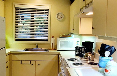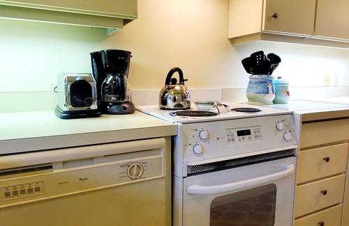 Kitchen -- fully stocked glasses & dishes, utensils, pots & pans, dishwater, microwave, toaster, coffeemaker, blender, and a Forman grill.