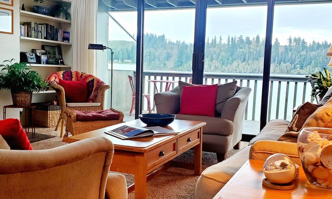 Welcome to our waterfront refuge! Here you can unwind on the spacious waterfront deck; listen to the gently lapping water, watch eagles, majestic herrons and countless seabirds. and mesmerized by the ever-changing lights and colors of the bay and the mountain range.