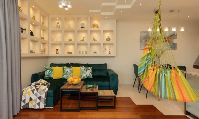 Perfectly located, comfortable and modern apartment, created for the most demanding guests. The apartment can accommodate 4 people and consists of a stylish living room with a kitchenette, a comfortable bedroom and a bathroom with a toilet and a bathtub. The apartment also includes a balcony overlooking the city skyline. The unique arrangement of the apartment and comprehensive equipment with the necessary kitchen and bathroom equipment as well as free Wi-Fi and a flat-screen Tv ensure a comfortable stay. The carefully finished apartment, its modern style decor in bold colors provide the apartment with a unique atmosphere and emphasize its high standard. The energetic colors of the interior guarantee a good mood throughout your stay! We also invite guests traveling with pets, because it is a pet-friendly apartment (pln 100/Stay).