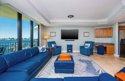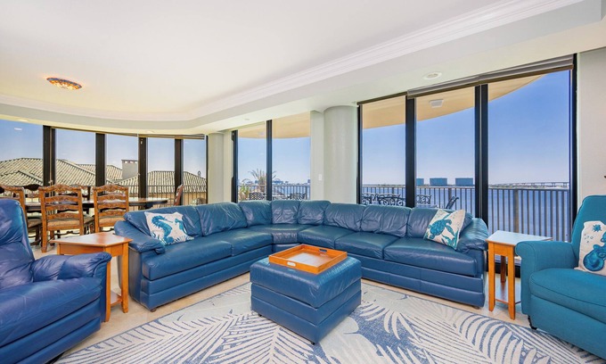 The Poseidon House, unit 1333, is a custom penthouse unit of nearly 4500 square feet, within the Phoenix on The Bay resort complex. This condo comfortably sleeps up to 22 guests to accommodate your entire family's needs. The Poseidon House boasts five spacious bedrooms, 6 full bathrooms, 2 half bathrooms, a theater room, 2 large wrap-around balconies, and a large combined living room, kitchen, and dining area with bar top seating and a dining table for 8. There is an additional 40-foot boat slip available to rent for those who wish to bring their own boat. Experience unparalleled views of the bay and the outlet into the Gulf of Mexico. Here you can witness both the breathtaking sunrise over the bay and a mesmerizing sunset, all from one incredible vantage point.