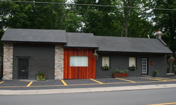From the exterior. I chose to design the building in a very trendy "urban industrial" monochromatic color scheme which uses a lot of one color in different hues. For this project I chose, carbonized grey. Hence the name, The Carbon Flat. I accentuated this dark and sort of 'blah' color with western red cedar, that I stained Mahogany Flame. It is quite dramatic, yet calming. I highlighted certain areas in stone, and others with foliage from local plants. We installed a wheelchair accessible, concrete ramp, at a 3 degree gradient, to not only allow for a wheelchair, but also make it easier for luggage and minimize someone tripping.