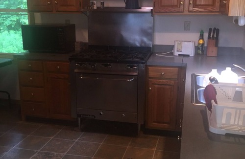 First floor kitchen has a propane commercial range with 6 burners and an electric stainless steel refrigerator. Fully stocked with pots and pans as well as plates, bowls and silverware.