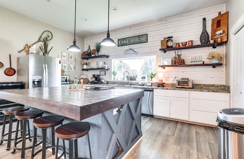 Only a stone's throw away from Lake Texoma, this beautiful farmhouse-style vacation rental in Pottsboro is perfect for a family getaway. Upon arrival, the 3-bed, 3.5-bath home's wraparound patio emerges from behind mature trees, inviting you to enjoy your morning coffee or an evening BBQ. A renovated open-concept living area awaits inside, complete with a gourmet kitchen. After settling in, explore the surrounding fishing community or dive into the lake from Mill Creek Resort and Marina!