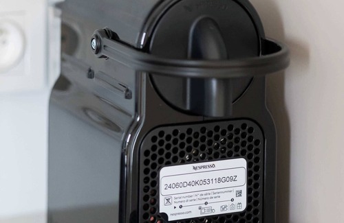 Electric hob, oven, dishwasher, steam extractor, capsule coffee maker, refrigerator, freezer, electric kettle, microwave, dishes, cutlery, wine glasses.