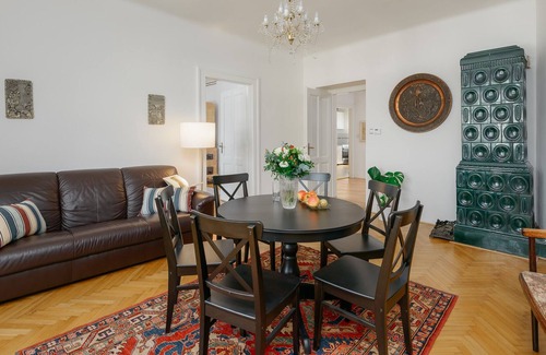 Hello. This is completely newly restored central Prague Great Apartment (120 m² with high ceilings) with 2 spacious bedrooms, living-dining room and a large and well-equipped dining kitchen. Bathroom and WC separated. It is fully equipped with all appliances (including WI-FI and internet access), suitable for big families with children and with a kind & helpful staff. And even with a possibility to park your car right nearby (300 m) on a paid for parking (€30 per day) on 116 Strakonicka street. We also propose on demand ( $ 16 per person on the basis of 3 persons minimum) a refrigerator load with breakfast/dinner food, which our guests greatly appreciate and found very convenient, especially families with children arriving late. So if you are looking for : CLEAN, COMFORTABLE, CENTRAL, Cozy and fully equipped apartment in Prague ? Then please do not hesitate. We have it.