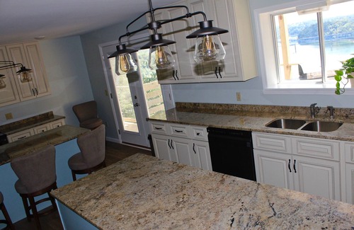 This was our first house of five that we chose for Lake Vistas Properties. It is a large three story lake view house located at 1254 Prather Dr. Nancy KY, less than a mile from Lee's Ford Marina and Pulaski County Park. Enough space to get lost in. A spacious open floor plan to hold large gatherings with plenty of driveway for parking and/or boats along with a very large 2 car garage. Four bedrooms (2 kings, full, and a full/twin bunk bed) with an additional cuddy (3 twin beds) room. Two full baths upstairs, full bath on main level, and half bath downstairs.Open floor plan on main level with full lake views throughout. Two sleeper leather twin sofas on main level also. Basement with full entertainment bar area, pool table, shuffle board, and foosball table, poker table, theatre room. Over 2,000 square feet of decking allowing for the full sound of all the action on the water. King rooms with private Juliet balconies. Main level decking full length of the house with lounging. Lower level decking off bar/entertainment area. Laundry room on main level with washer and dryer and utility sink. Full equipped kitchen, seating at bar area for 4 in kitchen, dining table seats 8, dishwasher, oven, microwave, 2 sinks, refrigerator with ice maker, all granite countertops, outdoor charcoal grill off of main deck of kitchen with outside dining for 6.