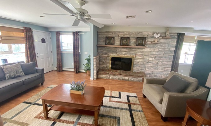 This spacious Lazy River 2 BR Summer Breese Suite has an open floor plan with a fully equipped kitchen with granite counters, living room, a sleeps up to 4 adults and 2 children under 12. Living room and all bedrooms include smart TV and internet router. Full size Kitchen, including small appliances, full size refrigerator, range/oven & microwave. All cookware & dinnerware provided. Full bathroom with tub and shower. Primary Bedroom has a Queen bed. Secondary bedroom has two twin beds, furniture, smart TV . Living room has a Queen sleeper. Large roof deck with spiral staircase with sun lounge chairs Outdoor Shower and BBQ. This property has a multi machine coin operate laundry just steps from the Cottage Standard WIFI Internet provided through out the property by FIOS . This property has central air conditioning through out.
