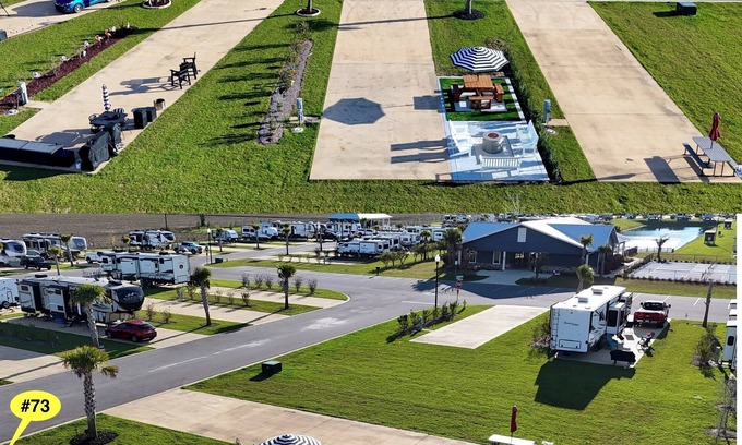 Presenting NEW premium sites at Grand Riviera RV Resort in Foley, AL! Site 73 is ideally situated just steps away from the Main Club House & heated pool, nestled in a tranquil cul-de-sac. Take a leisurely walk to nearby mini-golf & go-kart attractions. Indulge in the ultimate luxury RV camping experience with: