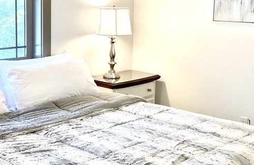 We guarantee you an extremely clean suite with luxury sheets and bedding, a full kitchen for all your baking and cooking needs, full washer and dryer inside your suite, dishwasher, stainless steel appliances, granite countertops, large living room, dining room, king sized temper-pedic beds, two twin mattresses with roll-aways, 800 thread count linens. Our suites do have A/C and heat. This Suite is located on the top floor and is a non pet friendly suite.