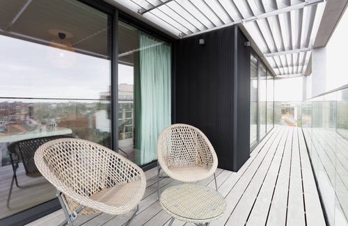 This prestigious exceptional apartment which offers a 360 ° panorama of the beautiful Brussels districts on the top floor of a new building, will charm you with its elegant design worked out with talent.
