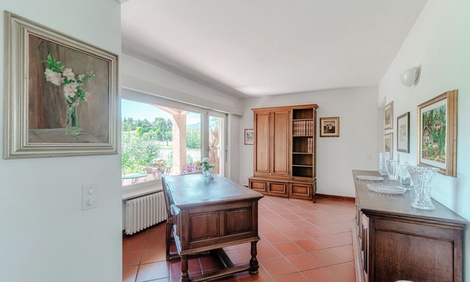 Inside, guests are welcomed into a spacious living area, lit by sunshine coming in through the large arched window, furnished with a sofa and armchairs for chatting with friends or reading a book, also chosen from the large bookcase. A desk content to study or work.