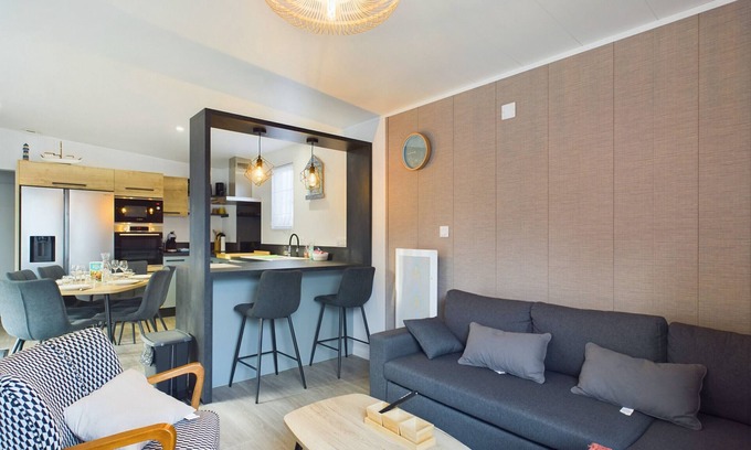 *This new residence is in the process of being completed on certain private plots. A few chalets are still missing and could be installed during your stay.Rest assured: all the common areas of your chalet (playground, swimming pool, entrance...) are new, clean and ready to welcome you for a holiday with complete peace of mind!Discover this cosy and recently built chalet, ideal for families and groups of friends! Located near the sea, this chalet will offer you a pleasant and relaxing stay.A covered and heated pool all year round will allow you to relax and fully enjoy your holiday.Upon your arrival, you will be charmed by a large living space, modern and warm, ideal for sharing convivial moments around the dining table.The fully equipped American kitchen includes everything you will need to prepare delicious dishes yourself. You will find a fridge-freezer, an induction hob, an oven, a microwave, a dishwasher, a kettle, a toaster, a citrus press, two Dolce Gusto and filter coffee machines, as well as all the necessary utensils.In the living room, a large comfortable sofa and 2 armchairs invite you to relax in front of a film or follow a sporting event on television.At night, the chalet offers three comfortable and air-conditioned bedrooms that can accommodate up to 6 people: a master bedroom with a Queen Size bed (160x200) and its adjoining bathroom with WC, a second room with a double bed (140x200) and finally a last one with two single beds (80x200).A bathroom with a shower and an independent WC complete this space designed for your well-being.A washing machine is also at your disposal for even more comfort, as well as two private parking spaces. In the domain, it is forbidden to charge electric cars on site – risk of general power cut. Charging points are available in town.Located near the beach and ideal for families, the rental is located at:- 900 m from the Jaunay sandy beach- 900 m from the Grande Plage- 3 km from the restaurant "Les Cabines"- 3.2 km from the restaurant "Hot Wok"- 3.4 km from the supermarket "Leclerc"- 4 km from Saint Gilles Croix de Vie station- 5 km from the Sauzaie beach- 11.7 km from the "Bluegreen du Pays de Saint Gilles" golf course- 44.8 km from La Roche sur Yon hospital- 57 km from the "O'Gliss Park" water park- 87 km from "Nantes Atlantique" airport- in the immediate vicinity of cycle pathsIdeally located in Saint-Gilles-Croix-de-Vie, you are close to Brétignolles-sur-Mer in the South and Saint-Hilaire-de-Riez in the North. Saint-Gilles-Croix-de-Vie is a tourist resort renowned for its fishing port and its famous Red Label sardines. Also discover its leisure port. Welcoming and warm, the life of this commune is paced by a certain gentleness. The beach, markets, villas, ports... Many activities await you to make your next holiday a magical moment!Your location is situated in a private and secure domain (access gate with digital code and video surveillance). Within the domain, you will also have access to a children's playground and a pétanque court.The swimming pool is heated to 28 degrees and open all year round.This accommodation benefits from a concierge service with a team available throughout the stay for personalised services.The rental has Wi-Fi access.This location is not suitable for people with reduced mobility.Animals are not allowed in this rental.The accommodation tax will be added to the rental amount and must be paid in advance of your stay.Ref : hoomy12180