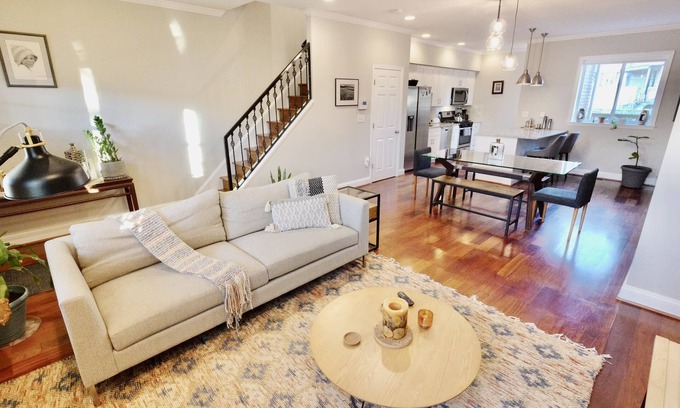 Welcome to Pretty in Petworth! Upon arriving be greeted by excellent craftsmanship and an oversized front porch. Be instantly wowed by hardwood floors and high end windows that keep the room bright and quiet. Open floor plan leads you to gourmet kitchen featuring stainless steel appliances and granite counters. Enjoy meals on deck, or in dinning area. Upstairs you will find 4 bedrooms with 2 King size beds,1 twin bed, 1 queen bed and washer and dryer. Walkable to metro and delicious restaurants on Upshur!