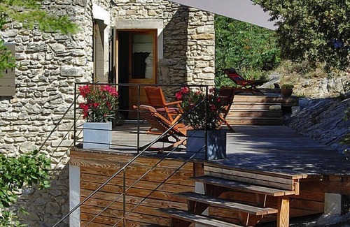 You will stay in absolute tranquillity in this tastefully restored mazet with its 55 sqm wooden terrace. The cosy cottage is located at the top of a historic stone village on the southern slope of the wooded ridge La Lance. From here you can hike on signposted trails up to the 1350 m high summit (5 km). The wooded hill behind your terrace offers beautiful views of the sunset valley of the Enclave des Papes, where lavender and wine thrive. In low season, a lovely wood-burning stove in the large living room spreads a pleasant warmth. The Drôme Provençale region, which has largely been spared the tourist crowds of the southern French coastal regions, is an insider's tip for anyone looking for a special ambience in magnificent nature. Characterised by lavender and olive cultivation, evergreen forests, rugged rock formations and gorges, this area is ideal for hiking and mountain biking. In the sleepy village of Le Pègue, which in Roman times was on a trade route from Marseille to Lyon, excavations have unearthed finds of Greek pottery, which you can now discover in the local museum.