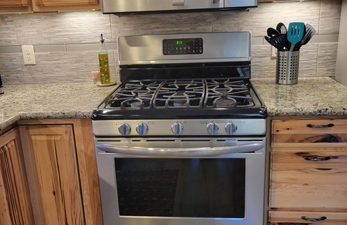 Our fully equipped kitchen features granite counters, hickory cabinets, under counter lighting and a large pantry for storage. Stainless steel gas stove, microwave, dishwasher, refrigerator with an ice maker and a huge sink with a garbage disposal. Other kitchen amenities include a toaster, blender, coffee maker, crock-pot, electric fry pan, roasting pan, cookware, tableware ,and spices.