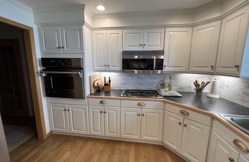 This is the lake house you've been dreaming of! It is located on the desirable south shore of Crystal Lake and walking distance from the quaint Village of Beulah. There's room for your whole gang! Perfect for family reunions & multiple families. Home offers over 3800 sq. feet of spacious living, fully equipped kitchen with stainless steel appliances, dishwasher, microwave, coffee maker, gas range, ice maker, bar area that seats 3, large dining table that seats 8, as well as large outdoor farm table right off kitchen overlooking lake. Enjoy the massive great room with cathedral ceilings, 2-sided brick gas fireplace which sits between main living area and an additional cozy sitting area. Spectacular views from every window! Additional living space in the partial basement which offers a large sectional couch, large screen TV, game table, and walk out to second level deck. Also included are basic cable, wireless internet, board games, & gas grill. Separate laundry room has newer large capacity washer/dryer, sink, iron/ironing board & additional storage for your use.