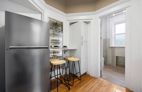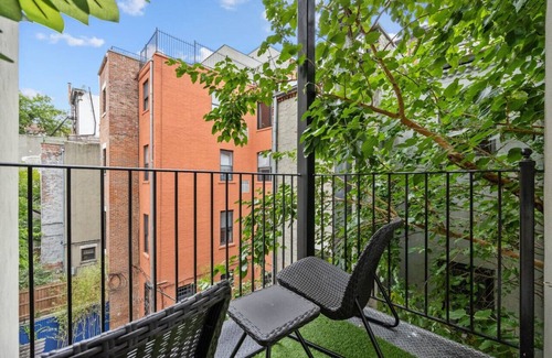 Welcome to "Vintage Luxe", an 1894 landmark by Frederick Dinkelberg, artfully restored into a luxurious boutique experience. This 2-bedroom combines old-world charm decor with modern comforts, featuring an accent fireplace, bay windows, a full kitchen, high-speed WiFi, and even a workstation. Private patio—a unique find in NYC—perfect for relaxation. With the metro just 1 minute away, it’s a great choice for families, groups, or any traveler seeking a central and luxurious NYC stay.