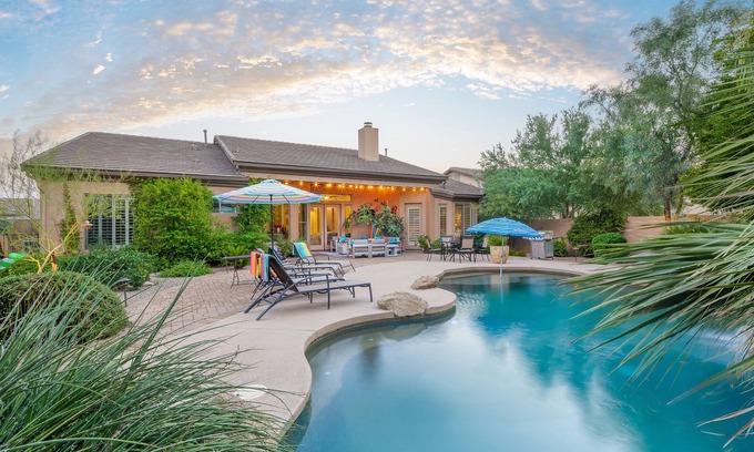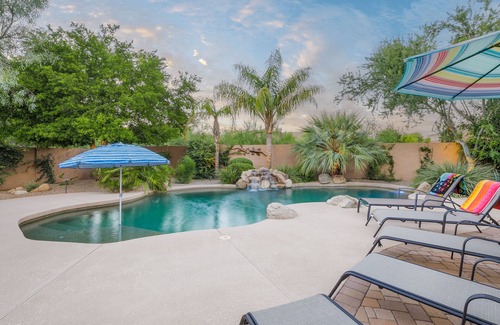 Escape to the beautiful Sonoran Desert and find your serenity at the Desert Flower home. Located just minutes away from popular shopping, dining, and entertainment districts, you will find endless things to do and explore during your stay. This bright home features four comfortable bedrooms, three full bathrooms, a fun game room, a relaxing heated pool, a covered patio with a fire pit, an outdoor BBQ, an upgraded kitchen, and much more!