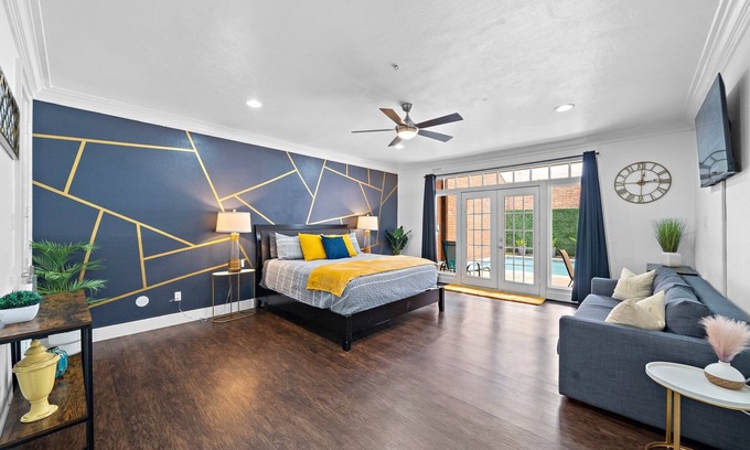 * Primary Bedroom (1st floor) - King Bed and sleeper sofa (sleeps 4), Private bathroom. Goes out to pool deck.