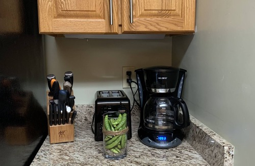 - Kitchen also includes coffee maker, blender, toaster, plates, bowls, cups, silverware, kids plates/cups/silverware (set of 4), dish soap, paper towels, highchair, pack 'n play, pots/pans, cooking utensils, ice maker, wine/bottle openers (isn't this what you always want to know!).