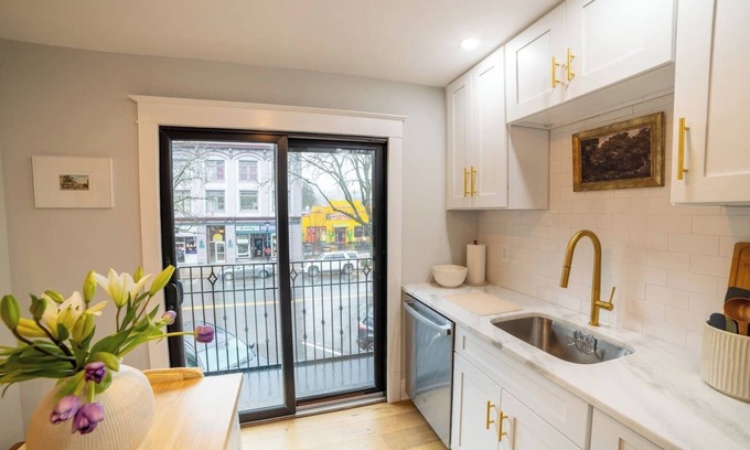 The kitchen is fully stocked with all your cooking necessities, new appliances, an island and a balcony overlooking Main Street.