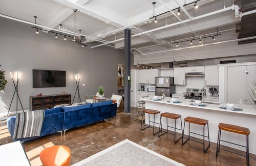 Enjoy Fort Worth in style with this industrial luxury loft that has been recently renovated, professionally decorated, and built for comfort. A perfect option for business travelers, couples looking for a night out, and tourists. The loft offers 20ft ceilings, large windows, a cook ready kitchen, and a 70 inch smart tv!
