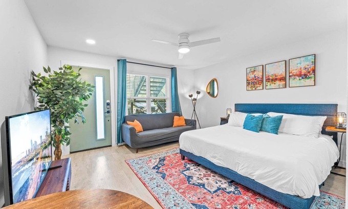 Our 400 sqft boutique studio apartment is pet-friendly (pet fees apply) and comes standard with a fully-stocked kitchen, 2-in-1 washer and dryer combo, flex table, full-sized bathroom, comfy king bed, & ultra-fast internet to accommodate you in the modern times.