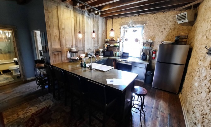 Private 750 sq ft 2 Bed 1 Bath unit located in a large Limestone building, built in 1860 with a rich history.. Close to Field of Dreams, hiking, hunting, and snowmobile trails. Scenic Iowa drives to many nearby river towns with small town shopping and great eats. Large living room with ambient lighting, 55" Smart TV, leather recliner and leather couch with pull-out bed. Large kitchen with concrete countertops, stainless steel appliances, utensils, and Keurig. Vaulted ceilings, 10' to rustic supports, then additional 15' to rooftop. Natural limestone walls throughout unit.