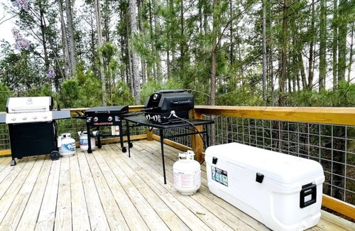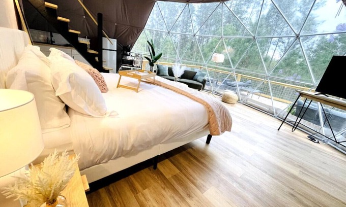 Enjoy a unique, luxury experience in nature in our private Princess Dome at Nine Pines Retreats! Step inside this fully furnished geo dome to discover a spacious retreat complete with kitchenette, heat and air, shower, toilet and the luxury heated jacuzzi tub. Lounge on the private deck complete with gas grill, blackstone griddle and pizza oven. Relax in the outdoor lounge area with firepit table. basking in the serenity of the valley of pines. Hiking trails and more available for your enjoyment