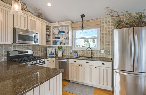 Amenities include: central AC, wireless internet, flat screen TVs in every room, cable TV, Blu-ray DVD player, alarm system, marble bathrooms, granite countertops, stainless steel appliances, spacious outdoor shower, Weber BBQ grill, community boat launch, mooring rights, and swim ladder to the bay.