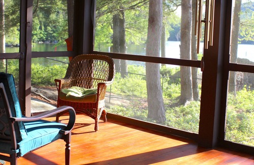 Nestled into the woods at the Southern edge of the White Mountains, our secluded lakefront home and guest house are located on Squam Lake, site of the movie 'On Golden Pond.' The two-cabin compound rests on four very private wooded acres with magnificent views of the White Mountains. The sizable screened porch has a wrap-around view onto one of the lake's most private and desirable coves. The main house, the guest house and a small sleeping porch (converted study) have wonderful sunset views of the lake, and are 35, 75 and 10 feet from shore, respectively. This is a tranquil spot 3 miles from the charming town of Center Sandwich, NH. The rental includes a dock, a kayak and two canoes free of charge. The homes have a washing machine, a washer, a dryer, wifi etc. and all amenities except TV. The house has a lovely large living room with a fireplace, and wonderful picture windows looking onto the lake.