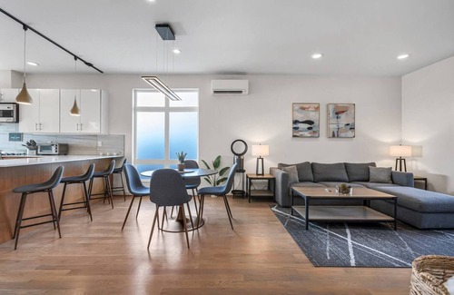 Take the stairs up to our open concept main floor with lots of windows and high ceilings. Here you'll find the living room with 65" smart TV, dining areas, and a fully stocked kitchen with plenty of space to inspire cooking enthusiasts.
