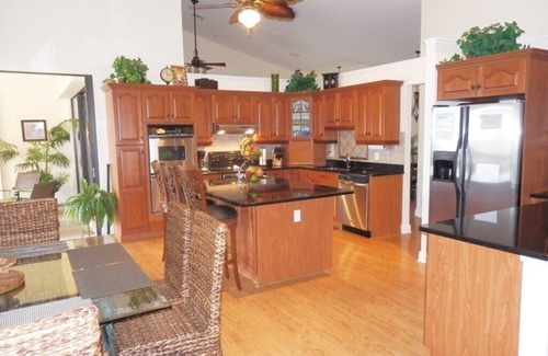 The large open concept living area has 1 sofa, 1 love seat and 2 chairs that seats 7, a 55” smart HD TV , a formal dining area that seats 8 and a breakfast nook that seats 4. You can extend your living space out via the sliding glass doors to the large, screened lanai and pool area; soon to be your favorite room!