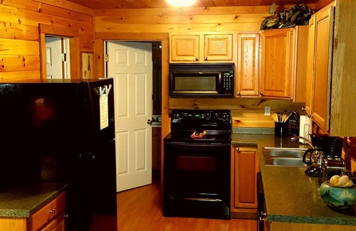 Inside, Pergo floors with colorful carpets, scores of knotty pine walls, and soaring wood ceilings remind you that you are in the mountains! A wood burning fireplace for those chilly nights, leather couches, and dining for six with windows overlooking the woods makes the open floor place of this vacation rental like a 'home away from home'! A huge 42' flat screen TV provides hours of digital entertainment, as does the stereo. High speed kinetic wireless internet (100 megs) is provided for your convenience.