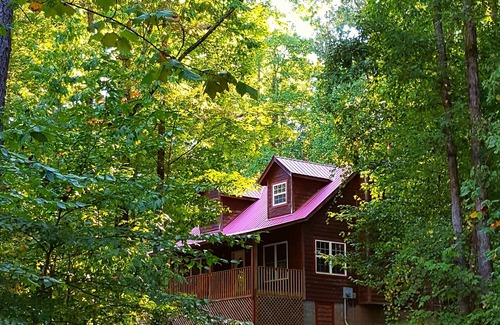Sheltered from the paved road, the setting of Sweet Comfort is completed by the graveled, pull-through driveway that encloses the classy looking cabin in foliage. Woods separate you from your only neighbor on the left. There is plenty of parking for guests, with no tight corners or steep climbs so that it's easy to drive in and out of the cabin. On arrival, a long elevated front porch overlooks the driveway and fire pit area. There is a Blink security camera that overlooks the driveway and front steps only.