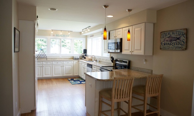 The kitchen contains all new stainless steel appliances along with plenty of cabinet space stocked with all of your needs to ensure that you can properly entertain and enjoy.