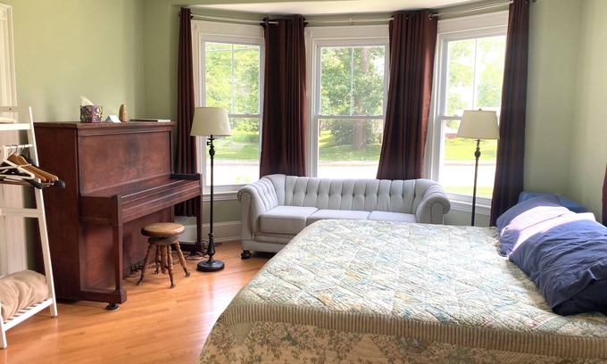 Bay windows brighten the living room/bedroom area, and blackout curtains provide privacy and block out light for sleep and for cooling in summer months. The king sized bed is prepared with cotton sheets and sets of firm and soft pillows. In addition to the bed, there is a couch where you can lounge and relax. A 32” Vizio smart TV as well as an upright piano help to keep you entertained. The fireplace has beautiful woodwork and tiles. (Fires are not permitted though.)