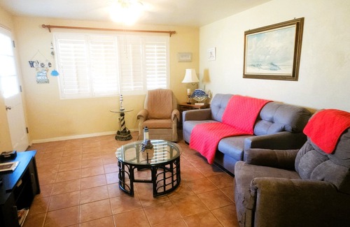 This beachside home offers an open floor plan. Private backyard with BBQ and is the perfect place to come and enjoy life! There is a large kitchen with plenty of cabinet and counter space. There is seating for four. The kitchen is fully equipped with microwave, coffee maker, and all the amenities from home. The sunroom has views of the private, fenced in back yard. There is an indoor laundry room. The living room has a flat screen TV., large couch and recliner. There are two bedrooms - one has a queen size bed; the second bedroom has two (2) twin beds. Both bedrooms have a TV. and large closet. There is one bath. Windows have wooden interior shutters for privacy, ceiling fans and much more. Everything you need to have to feel like you are at home.
