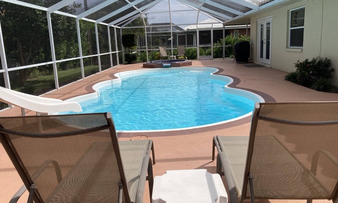 The home has two bethrooms that can sleep a total of 5 people with one full bathroom. Full kitchen, dining room, living room, garage with space for one car, lanai area, large pool with its own slide and Jacuzzi. The pool has an electric heat pump.