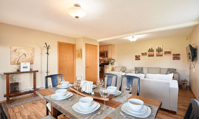The fully equipped kitchen has stainless steel appliances, granite countertops, and everything you'll need to create a wine country feast. The living room is appointed with a flat-screen Smart TV with satellite channels and a Roku. The dining area features a beautiful farmhouse table built by the homeowner using 100-year-old redwood. Laundry facilities are also available.