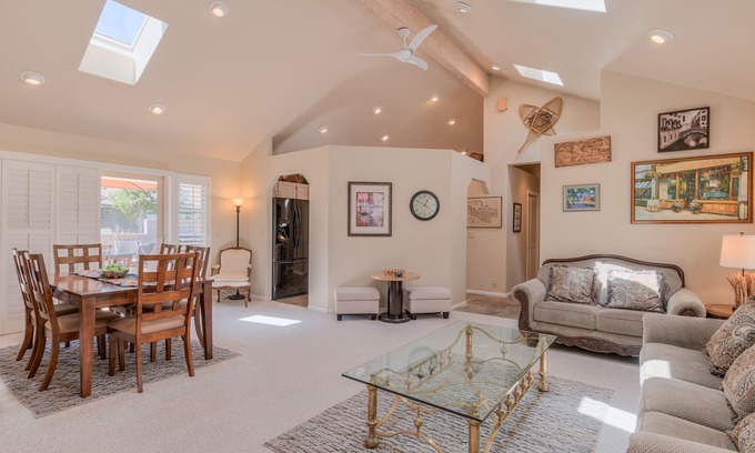 From the moment you walk into this charming single-level getaway, you’ll be greeted by an abundance of natural light pouring in through skylights and wide windows adorned with classic white shutters. It’s warm, inviting, and absolutely perfect for making lifelong vacation memories.