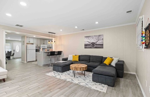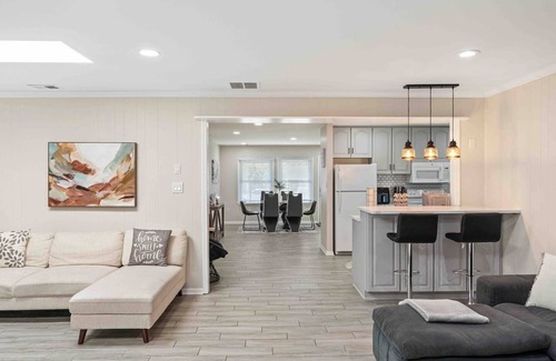 This amazing home is a one level single family home that has a open floor plan concept. There is 3 bedrooms and 2 full bathrooms. There is tile flooring throughout the entire home besides the bedrooms which has brand new carpet with memory foam padding. There is a queen size bed with memory foam mattress in each bedroom. We also have a twin air mattress there if needed. All of the bedrooms are equipped with a flat screen smart TV. The family room has a large 75 inch smart tv with a wall insert electric fireplace that changes colors and has a heater. High speed internet (500 Mbps) included in your stay for all of your business and personal needs. We have everything in the kitchen needed for you to cook almost all of your favorite home made meals. There is a fully equipped laundry room with laundry detergent, ironing board, and multiple irons available. There is plenty of storage areas and closets in the house.