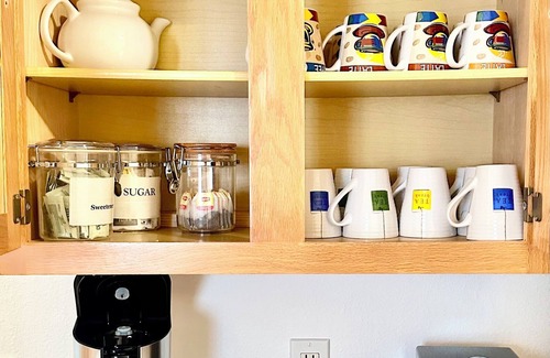 The fully stocked kitchen makes mealtime easy, with all the essentials: utensils, a coffee maker, tea maker, pots and pans, mixing bowls, glass baking trays and even an air fryer. Whether you're planning big family meals or a cozy breakfast before hitting the parks, we’ve got you covered.