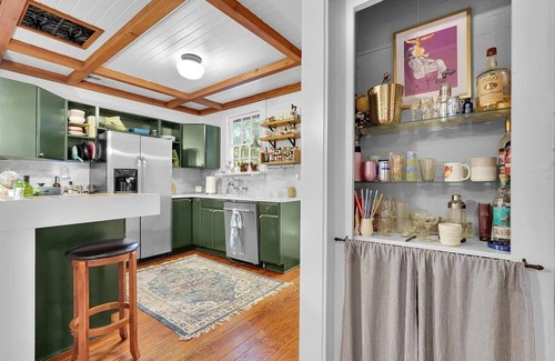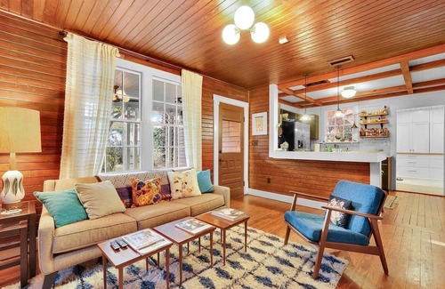 The Hemlock House is located 15 minutes south of the Historic District where you can relax in this peaceful, stylish and private space. The 2 bedroom, 1 bath home has an old cabin feel in half of it (built in the 1940's), plus a modern addition (built in in 2015) that includes a dining nook, coffee bar and large sunroom. This spacious room has a lounge area and standup desk if you need an office space. Off the sunroom, you'll find access to a spacious backyard that includes a charming swing that hangs from the Live Oak tree and a fire pit with four Adirondack chairs. To note- there is a small guest house in the back that can sometimes be rented out to other guests. Also to note, there is a primary bedroom suite in the main house that will not be accessible to guests.