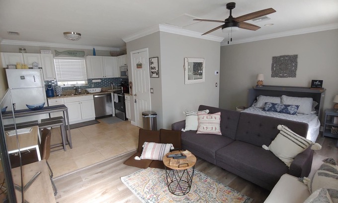 You will find your cozy space in the rear of our Key West style home separated by a tropical courtyard complete with private access to your Little Oasis. Nicely appointed apartment with all the comforts and amenities of home. Large bedroom/living room with full size eat in kitchen complete with dishwasher, large microwave, electric stove, Keurig coffee maker, toaster/ convection oven and other small appliances.