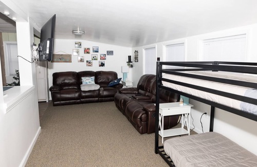 Primary bedroom has a queen bed and 42inch flat screen TV, the guest bedroom has a full size bed and there is a bunk bed in the living room for the kids!